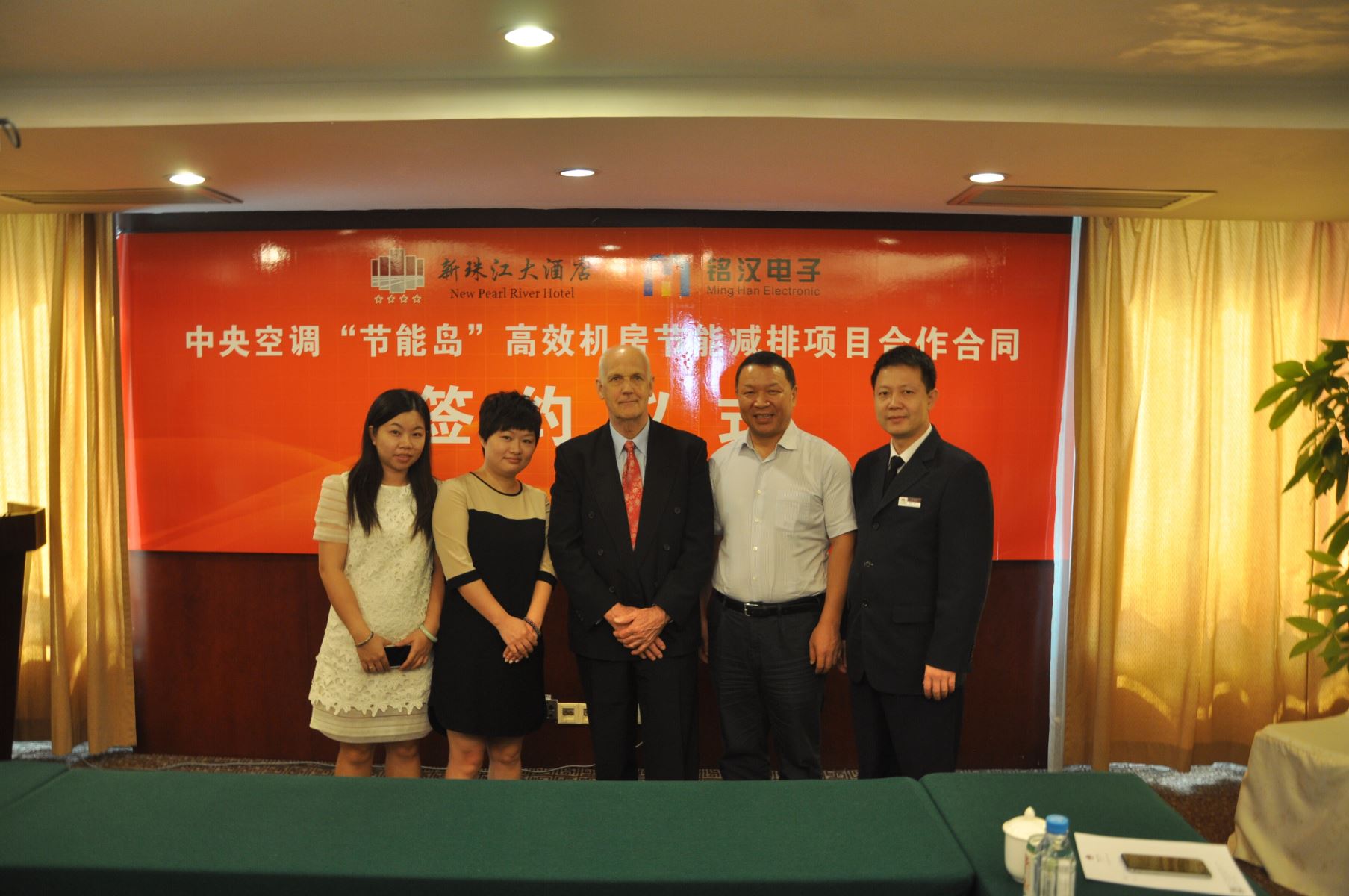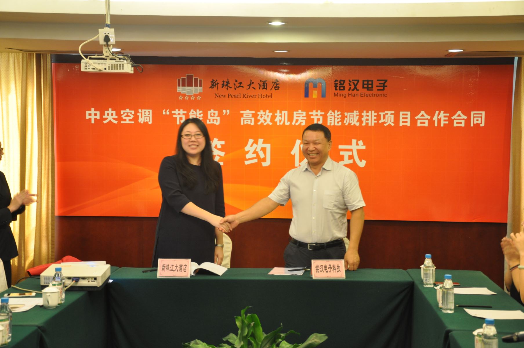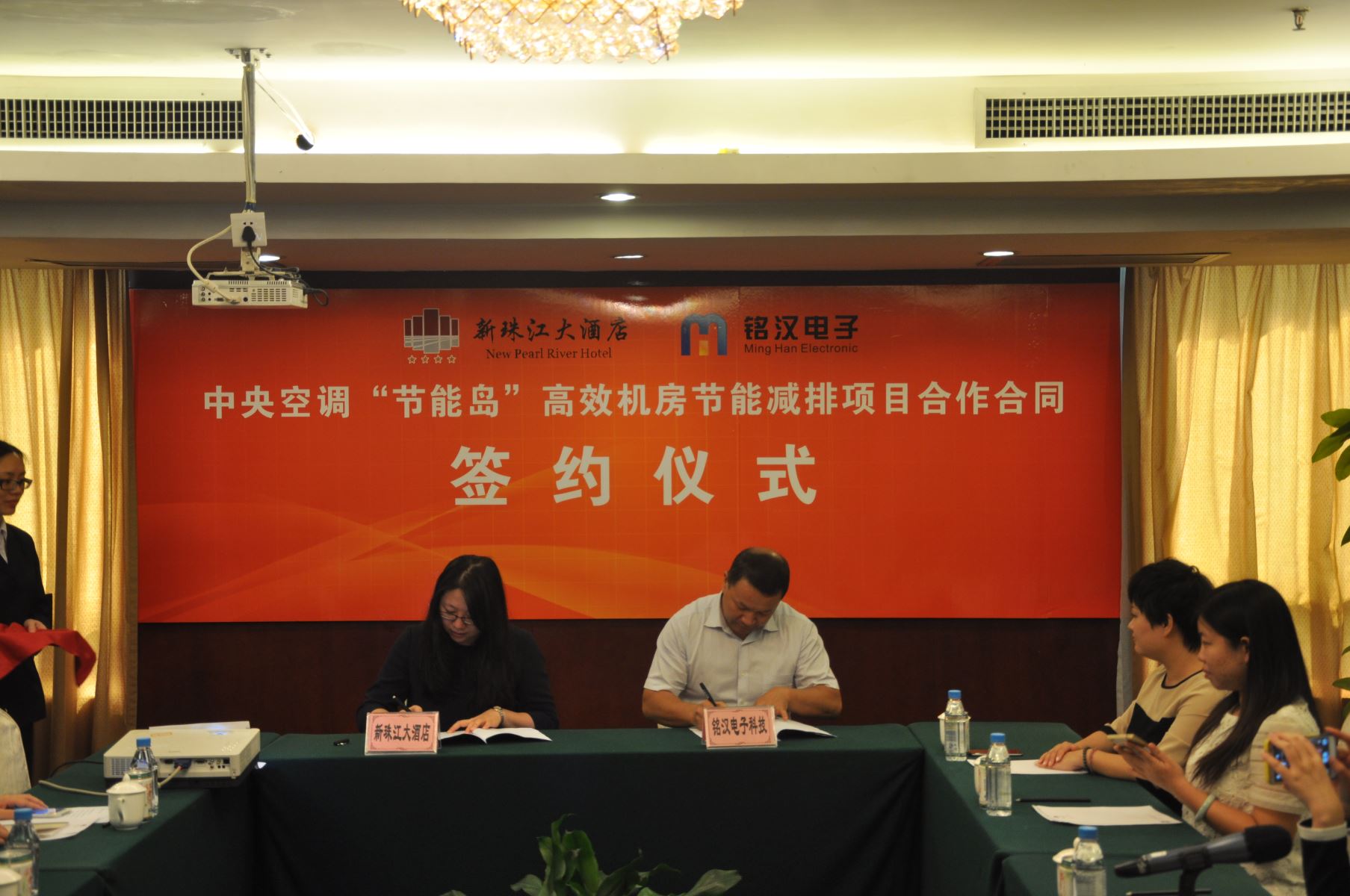 2015年10月20日上午10點半,在廣東新珠江大酒店舉行了中央空調(節能島)高效機房節能減排項目合作合同簽約儀式暨項目介紹會。 參會代表人員有節能協會領導、海珠區發改局節能減排辦負責人、酒店協會領導、廣州市銘漢電子科技有限公司、新珠江大酒店。