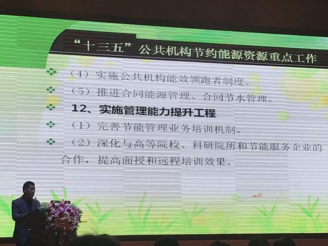 廣東省節能監察中心張娜主任、廣東省政府機關事務管理局秘書處方廷榮調研員、廣東省社科院環境經濟研究中心吳大磊副主任等領導在會上對當今國家和廣東省的節能政策作出解讀,其中合同能源管理是當下重要的節能方法之一,政府對此大力支持。